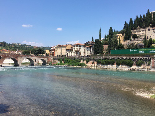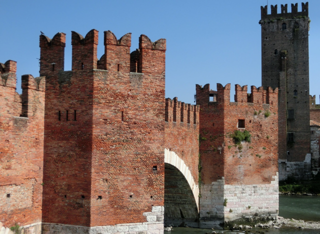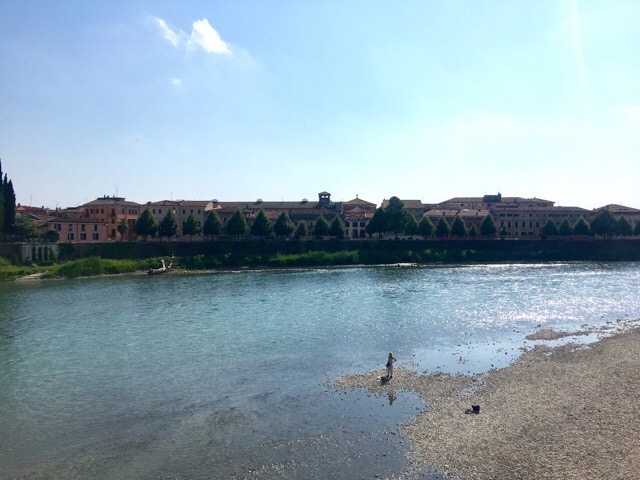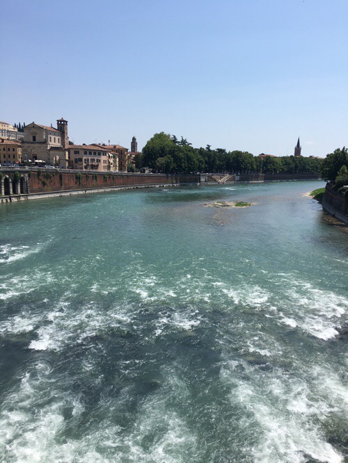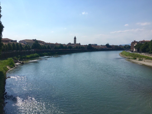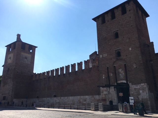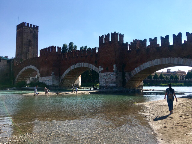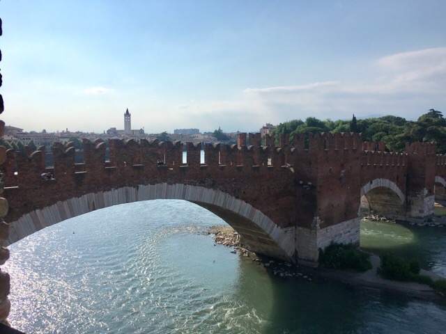07 (土)02:34July 7/1 ベローナ♡カステルヴェッキオとスカリジェロ橋 ヴェローナのアディジェ川のほとりに、14世紀中ごろスカラ家によって建てられた城塞。城内は現在、市立美術館になっており、中世のヴェローナ派やヴェネツィア派の作品を展示しています。大したことないと思って行ったんだけど、中世のお城の雰囲気のままレンガ造りの堅固な橋にうっとりした。高い時計塔とレンガの塀が見えてきたらおーーーって思った♡ ヴェッキオ城【Castel Vecchio】って書いてある。 なかに入ると中庭。 塀に見えるけど中を人が歩いているので行ってみようと思った。橋だ。スカリジェロ橋【Scaliger Bridge】アディジェ川にかかっていて向こうまで渡れます。見張り塔が高い。 振り返ってみた。なんて素敵な景色♡中世にタイムスリップ! トンネルを抜けると、アディジェ川の上、橋の部分に出ました。 上の段に登ることもできて、道幅も広くて、石畳。橋というより道路だ。途中、道幅が広くなってちょっとしたスペースになってる。中世というのは5~10世紀の時代。今から1000年以上前にこんな堅固な橋をつくるということに驚嘆するばかり。 ところどころにある小窓のようなところから眺めるアディジェ川。 向こう岸に渡ったら川辺に降りられます。すっごくキレイだ♡ 川の水の色が海みたい。なんて美しい景色なんだ!こんな景色の中に入れるなんてveryveryHappy♡♡ 渡りきった側から見たスカリジェロ橋。 この後、城内に入りました。カストロヴェッキオは、イタリアではそんなにメジャーではないけど、とても良かったです。もちろん世界遺産です。# Ponte de Castel Vecchio# Scaliger Bridge つづきはこちら 2018-07-07 (土) | イタリア ベローナ コメント(0)