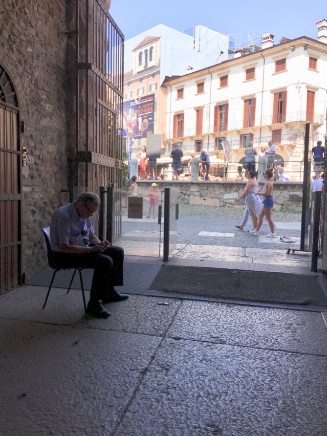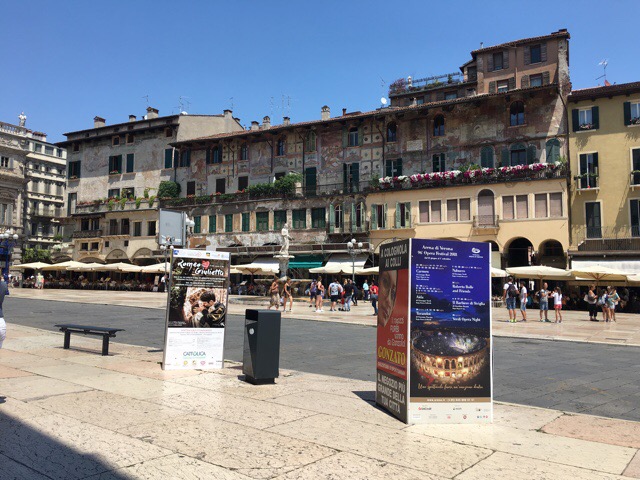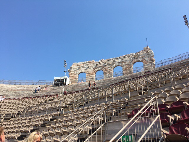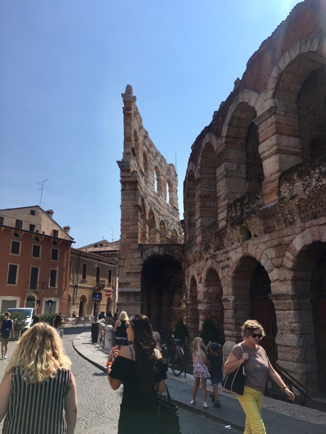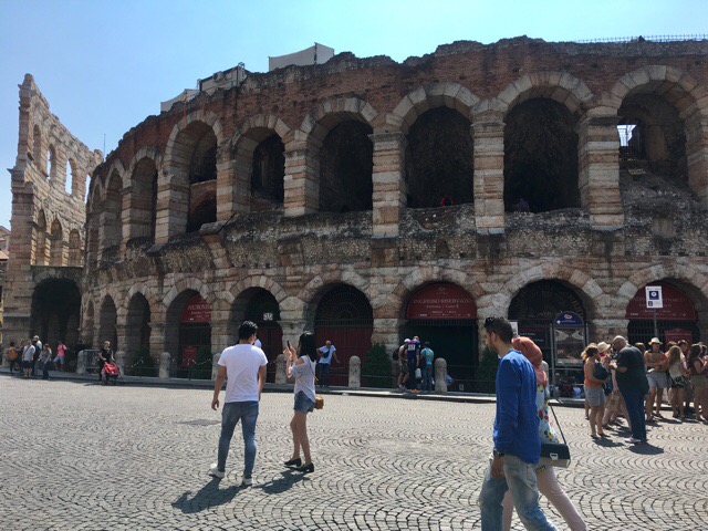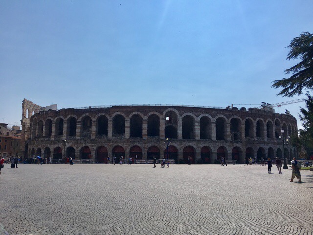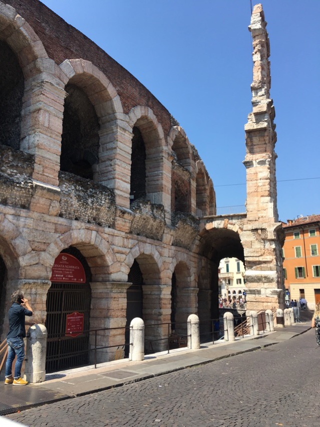 26 (木)14:41July ヴェローナ① コロッセオ 旅10目は、ベネチアからヴェローナに移動してヴェローナ観光。当初、ベネチア3日間→ミラノのつもりだったけど通り道だから、せっかくなら行きたいなって決めたのです。朝8時の列車でヴェローナには9時半頃着。ホテルにトランク預けて街歩きスタート。 7年ぶりのイタリアらしい街並みがステキでウキウキしてた。まずはコロッセオ。長径139メートル、短径110メートルの楕円形。ローマ帝国初代皇帝アウグストゥス(在位 前27年 - 14年)の統治末期か、遅くとも30年頃完成したと考えられているが正確な日時は特定されていません。観客席は44段の大理石製で、収容人数は約25,000人。 コロッセオ、いくつも見てるから感動度低いけど、せっかく来たから中に入った。入場料 €10 毎年6月下旬から8月にかけて野外オペラが開催されるので、その準備中。 オペラで使用されてるからトイレも完備してて、スポットクーラーが効いて中は涼しかった。 青い空に白い大理石の壁が映えてたー♡すごく暑かった。 ここは出口。係の人、スマホしてた。日本では、こんな場所でスマホするなんてご法度だけど、ヨーロッパは、じっとしている職場なら仕事中でもスマホしていいのよね。どこでもそうだから、そう思うようになった。 アウグストゥスがローマ皇帝だった2000年前からここに存在してるってすごくない?2000年間。。。ロマンだ。。だから、遺跡が好き。外観は2階建てのアーチ(あるいはアルコーブ)で、外周に大理石造り、3階構造のアーチをもつ外壁が存在していたけど、1117年の地震で大部分が倒壊、僅かにその遺構を北西部に留めるのみである。そりゃ、壊れるよね。2000年間、変わらない方が奇跡だもん。 この後、ジュリエットの家&エルベ広場に向かいました。 2018-07-26 (木) | イタリア ベローナ コメント(0)