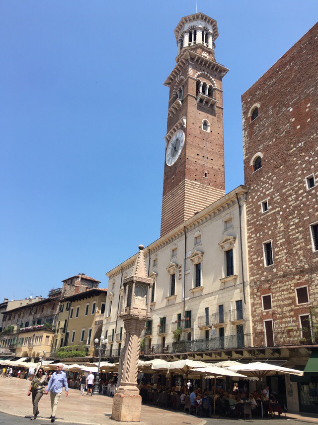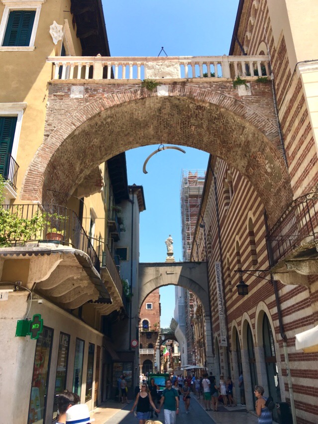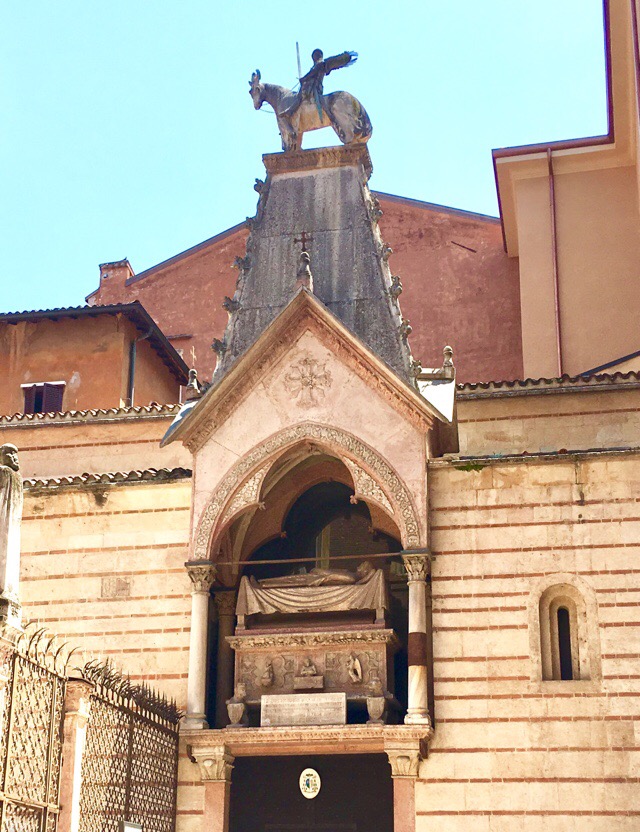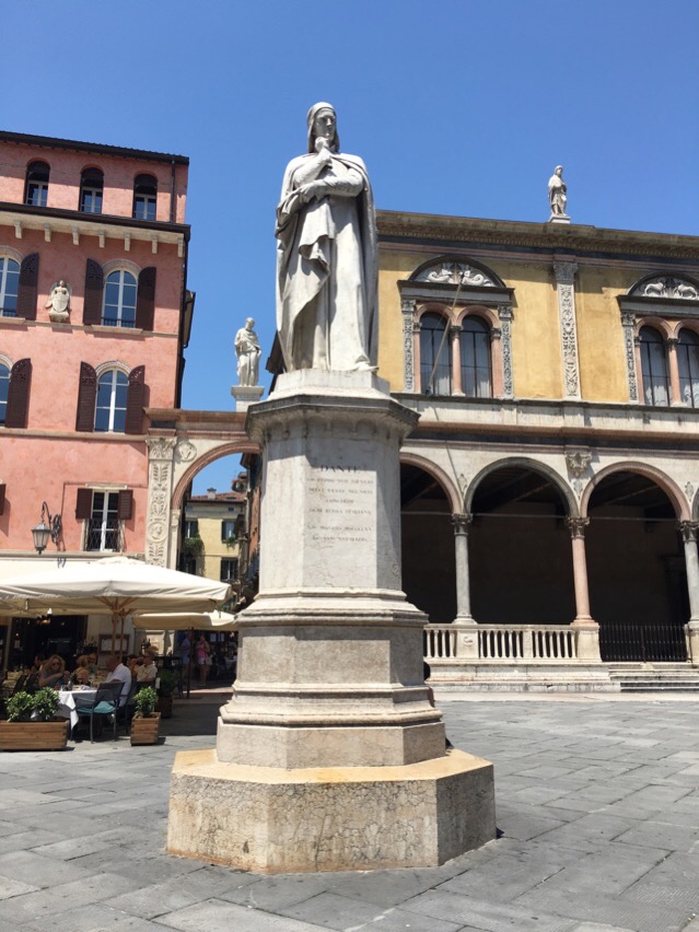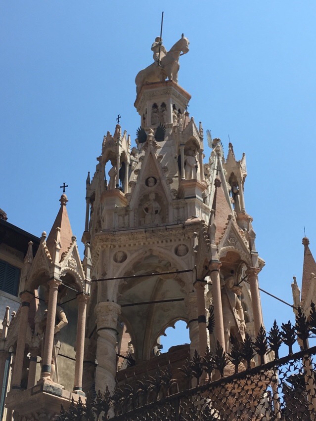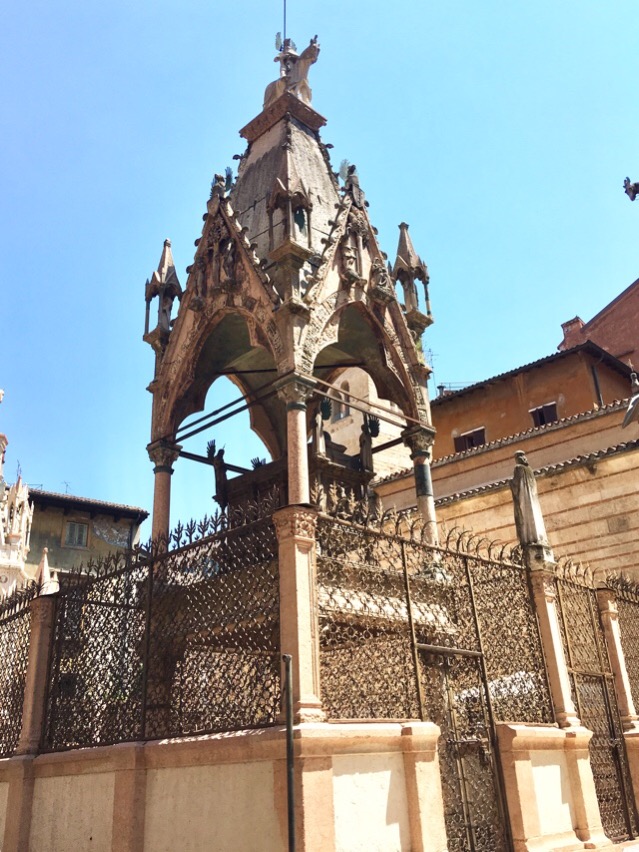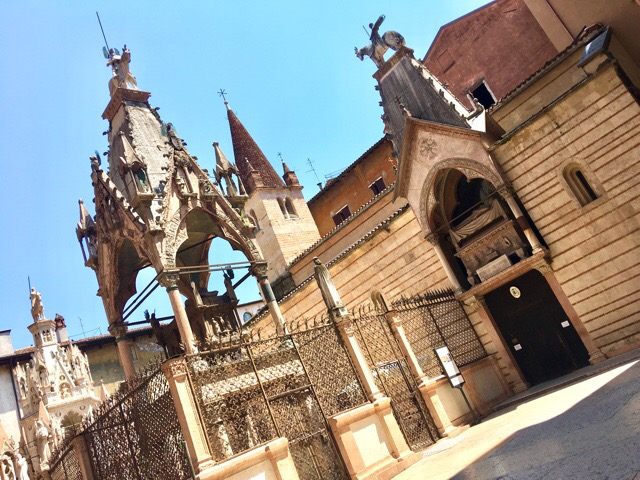 26 (木)23:33July ヴェローナ③ エルベ広場 ジュリエットの家の前の道を歩くとすぐにエルベ広場が見えます。ローマ時代には、フォロ・ロマーノと呼ばれ、市民が裁判や政治集会を行った公共広場だったそうです。 ランベルティの塔 おしゃれなアーチをくぐってエルベ広場からシニョーリ広場へ。中世っぽくてステキ♡ シニョーリ広場の中心に立つのはダンテの像。「考える人」 ヴェローナにダンテの像があるとは。。(๑>◡<๑)ダンテがフィレンツェ追放の後に、一時期スカラ家の庇護を受けてヴェローナに滞在していたそうです。この像はダンテ生誕600年を記念して1865年5月14日に落成されたもの。シニョーリ広場を抜けると繊細な模様の細工がある何?これ。美しいけど何だろう??と思ったらお墓でした。13世紀から14世紀にかけてベローナの領主だったスカラ家の一族が眠っています。中に棺が置いてあります。 隣接するのは、12世紀創建のサンタマリアアンティカ教会。スカラ家の教会だそう。教会入口の上にも棺。 後方にも同じような四角い囲いの中に棺。 スカラ家、すごいね。こうして永遠に、いつしか観光地となってたくさんの人から見られるって。。魂は安らげるのだろうか?とーか、考えちゃいますね。イタリア語で スカラ(Scala)というのは、はしごや階段という意味でスカラ家の紋章は、はしごの形をデザインしたものなんだって。このあと、ローマ劇場に向かいましたか、途中のアディジェ川に魅了されたのでした。ビエトラ橋がかかる辺りは流れが早くて水飛沫がとっても美しかった♡ 2018-07-26 (木) | イタリア ベローナ コメント(0)