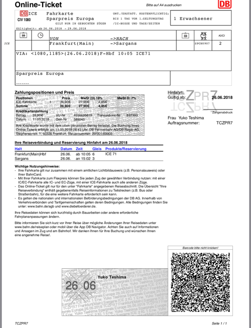13 (金)12:07July Zell im Wiesental ドイツ鉄道③ さて、私が迷子になりかけたドイツ鉄道の旅。ツェルがどんな街か気になりました。疲れ果てて写真も撮ってないので、記憶が残っているうちに駅がどんなだったか思い出したくてツェル検索ツェルという地名は、スイスやドイツにいくつかありますが、わたしが降りた駅は、Zell im Wiesental (ツェル・イム・ヴィーゼンタール)あの時は曇り空だったので、こんなに美しく見えず、心と同じにどんより暗い風景だったけど。笑 そう、この線路。今、見てもやばい。単線、ワンホーム、田舎感、ハンパないって。写真のとおりを体感しました。懐かしいーーーーっこんなことがなければ、一生知ることもなかった町。Zell im Wiesental (ツェル・イム・ヴィーゼンタール) 観光するところもあるみたい。いつか、リベンジしたいヨーロッパの歴史や街は魅力的。旅5日目のフランクフルト⇒マイエンフェルト鉄道の旅は散々だったけど、良い経験になりました。バーセルで、再度作ってもらった乗継表。バーセルのDB職員はメガネかけた太った女だった。すごく感じ悪かった。 ブスデブ女だから性格悪いなって思った。そして、フライブルクでもらった乗継表をとって返してくれなかった。でも、それ返してって言えなかったの。疲れ果ててたから。 ドイツ鉄道、何もかも適当。今回の旅で、日本人のおもてなし精神・お客様対応は素晴らしいとつくづく感じました♡日本人って奥ゆかしくて、礼儀正しい。(例外もいっぱいいるけど)I LOVEJapan笑 2018-07-13 (金) | ドイツ鉄道 コメント(0)